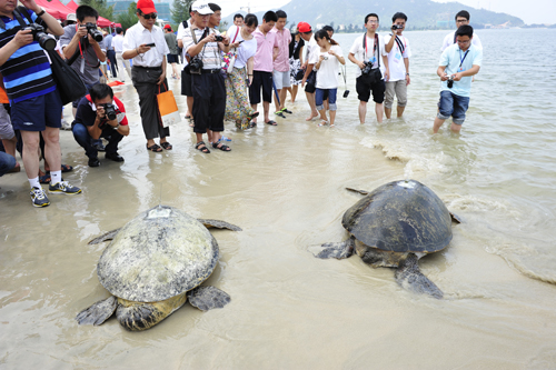 省政府副省长刘昆、、省海洋与渔业局局长郑伟仪和惠州市市长陈奕威正在放生海龟